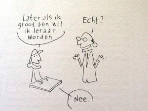 Een deel heeft gaandeweg misschien toch de roeping gevonden die het onderwijs eigenlijk is en een deel doet het omdat het in elk geval een maandinkomen garandeert. Het is eigenlijk een beetje vreemd dat in het onderwijs, waar de intellectuele ontwikkeling van een land van afhangt, mensen terechtkomen die er eigenlijk helemaal niet wilden zijn. Die mensen wilden allemaal naar de andere middelbare opleidingen, die ze helaas niet hebben gehaald. Er mogen eigenlijk helemaal geen afvallers op de pedagogische opleidingen terechtkomen; het moet altijd een keuze zijn, een roeping!