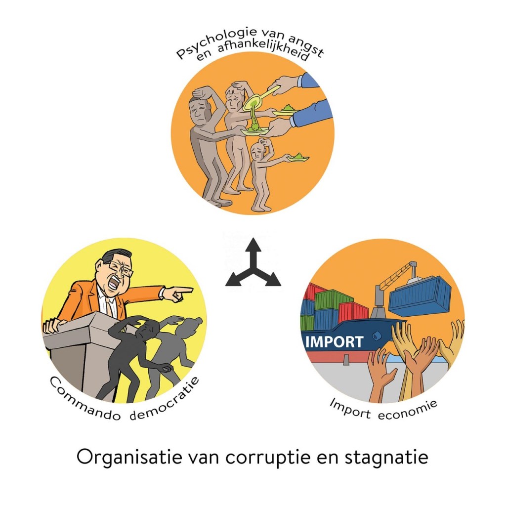 Ik kom tot deze conclusie omdat ik elke samenleving probeer te begrijpen vanuit drie kerndomeinen die elkaar beïnvloeden en de werkelijkheid, zoals wij die elke dag ervaren, creëren: het politiek domein, het economisch domein en het psychocultureel domein. Onze cultuur wordt gekenmerkt door angst en afhankelijkheid. En onze politieke partijen kenmerken zich door een commandodemocratie die onder andere andersdenkenden afstraft. Onze economie is een importeconomie die nauwelijks eigen inkomsten oplevert waardoor Suriname afhankelijk is van buitenlandse financiële hulp en leningen. Het samenspel tussen deze drie maatschappelijke domeinen resulteert al 46 jaar in corruptie, armoede en stagnatie.