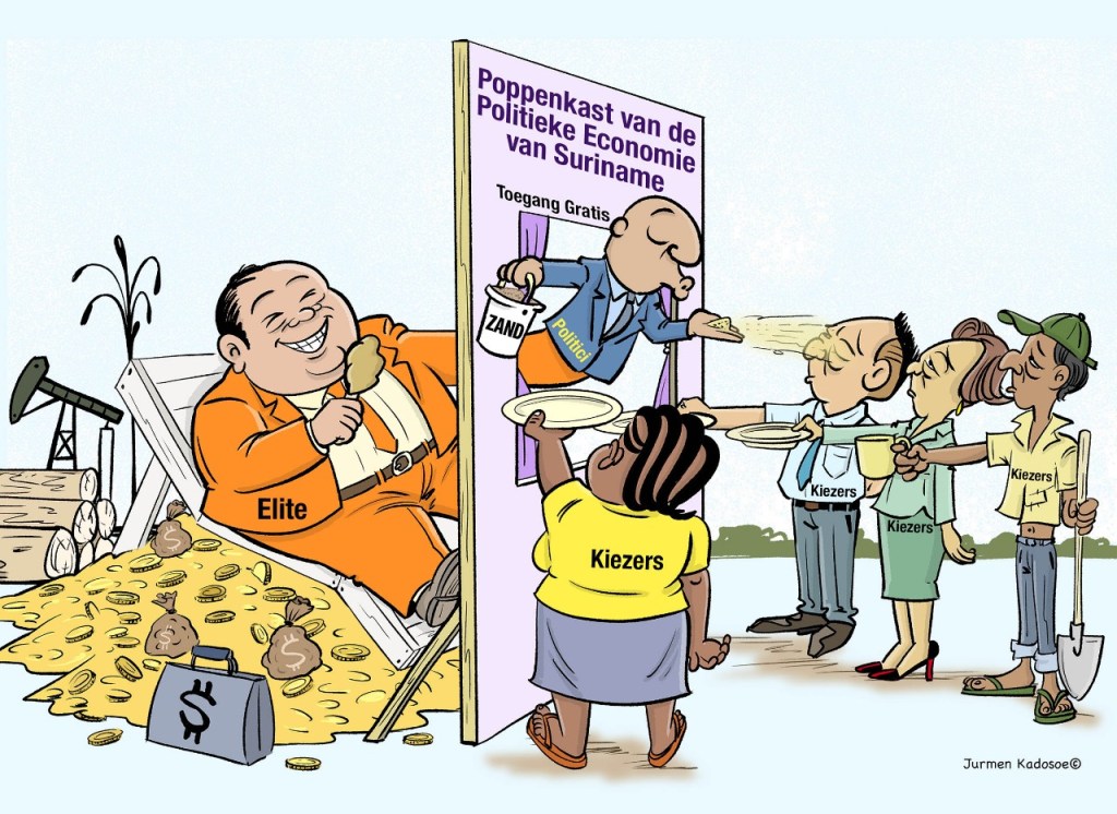 Net zoals in heel veel landen met grote sociale en economische ongelijkheid, zijn in Suriname de economische en politieke elite vrienden en bondgenoten van elkaar… let wel: dwars door etnische en partijpolitieke scheidslijnen heen. Zij misbruiken achter die etnische façade het staatsapparaat voor eigen gewin. Dit ten koste van de welvaart en het welzijn van de meerderheid van de bevolking. Politici zijn de toneelspelers van deze samenzwering die “het volk” zand in de ogen moeten strooien. Voor deze rol worden ze rijkelijk beloond. Zij vormen het rookgordijn voor de corruptie, het witwassen, de smokkel en andere contra-ontwikkelingshandelingen van zichzelf en hun economische bondgenoten. De politiek-economische elite wordt rijk door middel van het beroven van onze staat in plaats van het zelf creëren van rijkdom.