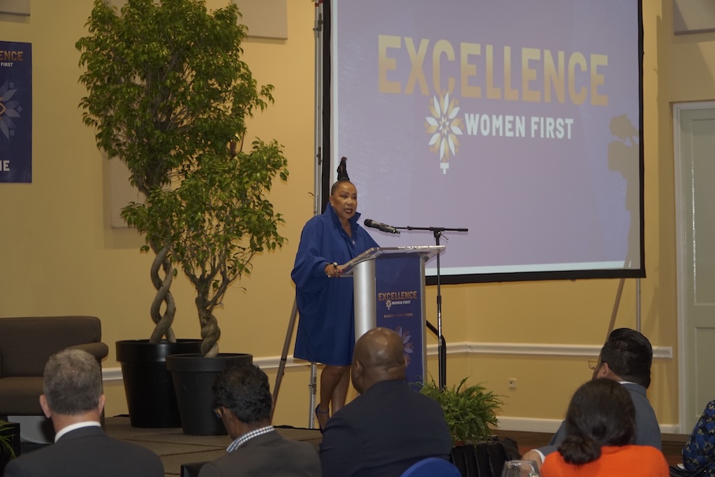 Karin Refos, lead consultant van de campagne ‘Excellence … women first’, staat in haar toespraak stil bij het logo en het begrip excellent; het sleutelwoord in de slogan. Refos: “Het logo is een artistieke vertaling van het vrouwenteken, gebaseerd op de lotus. Die staat symbool voor reinheid, volmaaktheid en de vrouwelijke kant van de mens. In het centrum van de bloem staat de leider. De achtpuntige ster, communiceert met alle omringende bladeren.