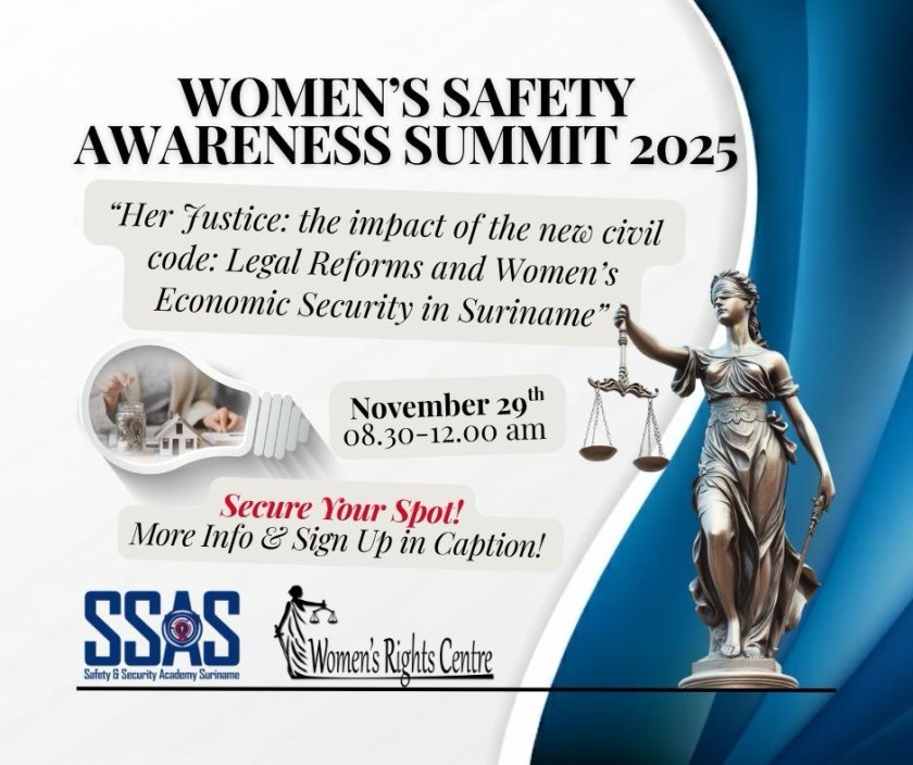 Zaterdag 29 november is het zover. De Safety and Security Academy Suriname (SSAS) en het Women’s Rights Centre (WRC) staan dan klaar om jou te verwelkomen op de Women’s Safety Awareness Summit 2025.